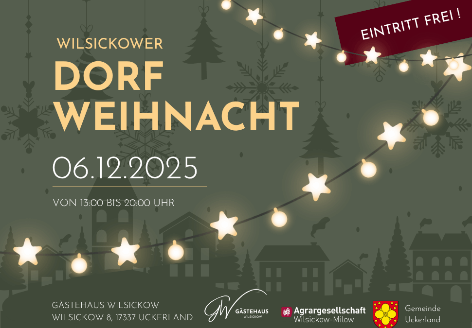 11. Dezember 2025Gemeinsam mit dem Gästehaus Wilsickow veranstaltet die Gemeinde Uckerland den Weihnachtsmarkt 2025 in diesem Jahr in Wilsickow. Hierzu laden wir Sie recht herzlich ein. Freuen Sie sich auf viele tolle Händler, köstliche Speisen und Getränke, weihnachtliche Stimmung, Basteln mit Kindern, Musik und natürlich auf den Weihnachtsmann.